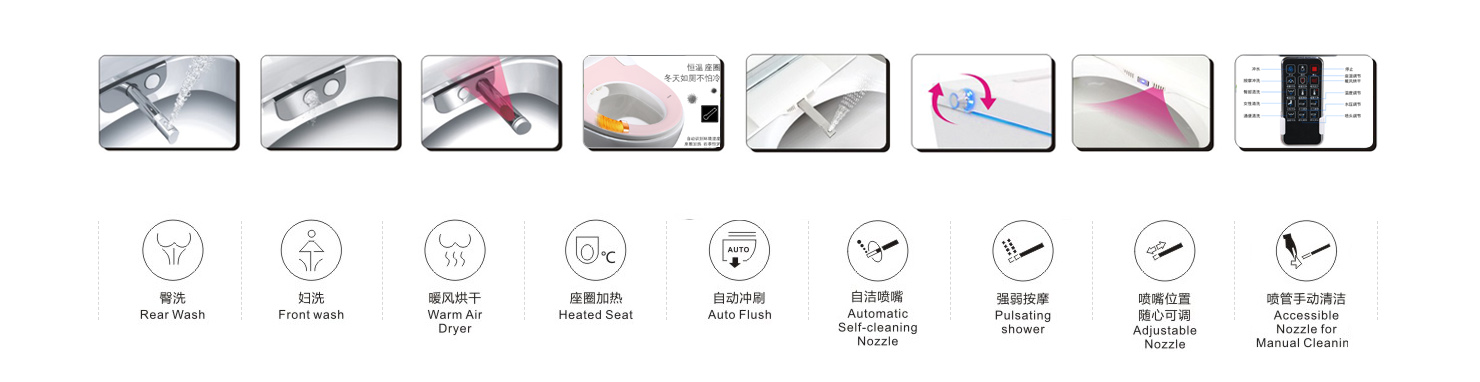 Enter公司堅持不懈的自我完善,倡導(dǎo)產(chǎn)品以人為本、科技為先,服務(wù)優(yōu)質(zhì)高效。以生產(chǎn)研發(fā)高質(zhì)量的產(chǎn)品為目標,繼續(xù)推動創(chuàng)新與發(fā)展,使產(chǎn)品的系列化、多樣化與結(jié)構(gòu)的多元化,滿足不同客戶的差異化需求。 公司研制的智能馬桶豪潔、舒潔、美潔三大系列產(chǎn)品款式引領(lǐng)衛(wèi)浴時尚潮流,造型多變,設(shè)計精美小巧,生動的展現(xiàn)現(xiàn)代藝術(shù)精髓,彰顯世上而富有情趣的生活空間是賓館、酒店、寫字樓及家庭裝潢的理想選擇。